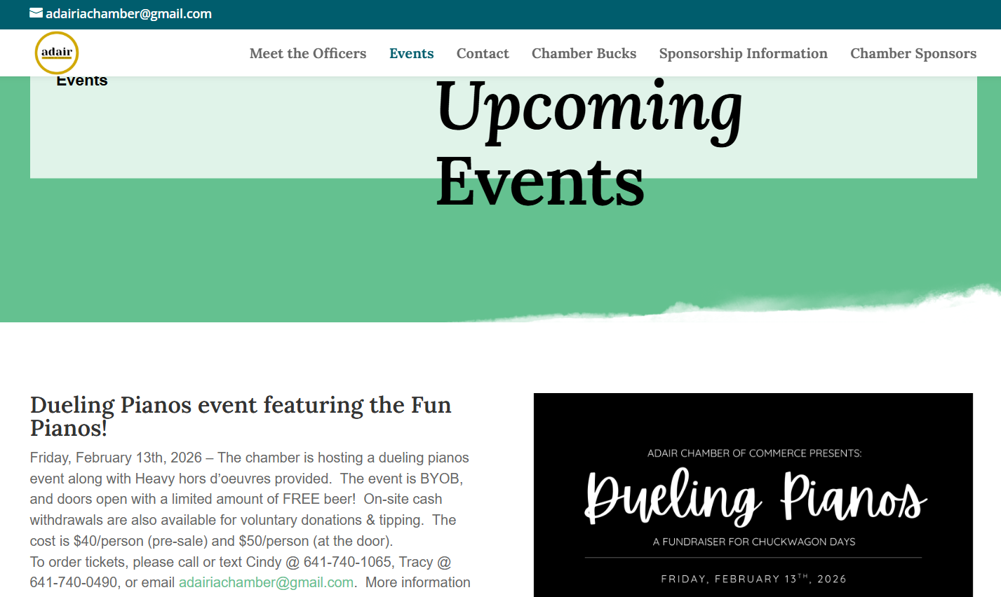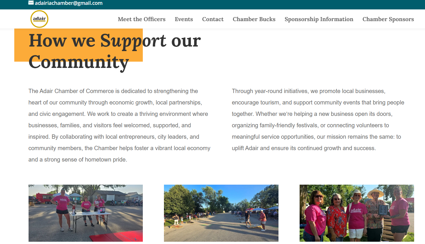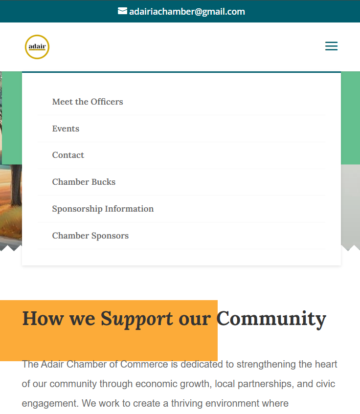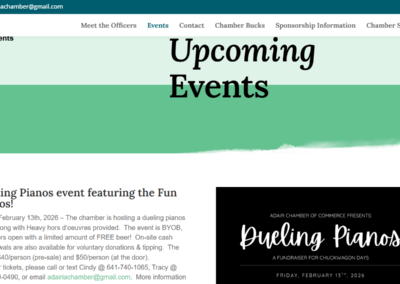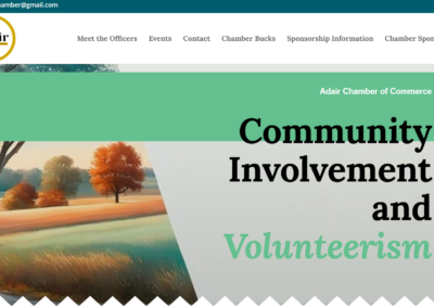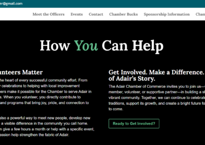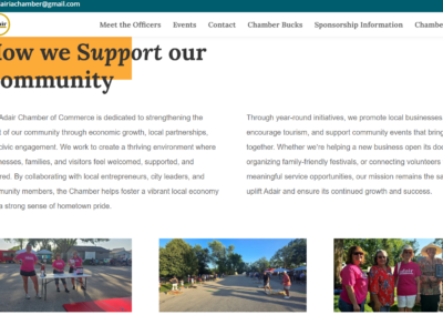 A key feature of the Adair Chamber website is its dynamic event calendar, allowing community members to stay informed about upcoming events, meetings, and local activities. The site also includes photo galleries that showcase past events and highlight the vibrant spirit of Adair. Dedicated sections such as “Meet the Team” introduce Chamber leadership, while clearly outlined volunteer opportunities make it easy for individuals to get involved and support local initiatives. These features not only improve communication but also foster stronger connections within the community.