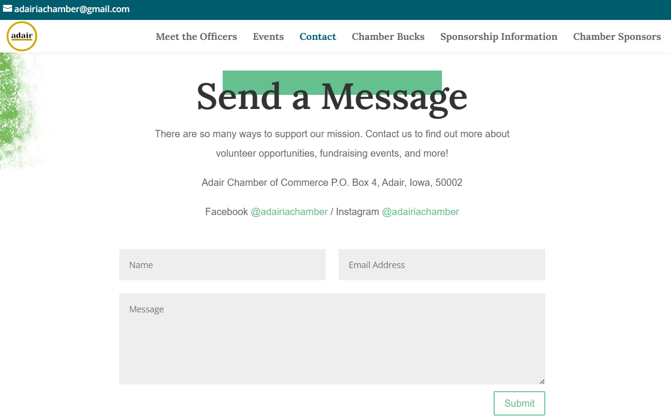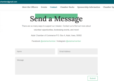 To further support economic growth, the website includes detailed sponsorship opportunities and a searchable directory of current sponsors, giving local businesses valuable online visibility. Each sponsor listing enhances local SEO while promoting chamber members to residents and visitors alike. An integrated contact form provides a convenient way for inquiries about membership, events, sponsorships, and general information. The result is a comprehensive, easy-to-manage website that serves as a central hub for the Adair Chamber of Commerce and the greater Adair community.